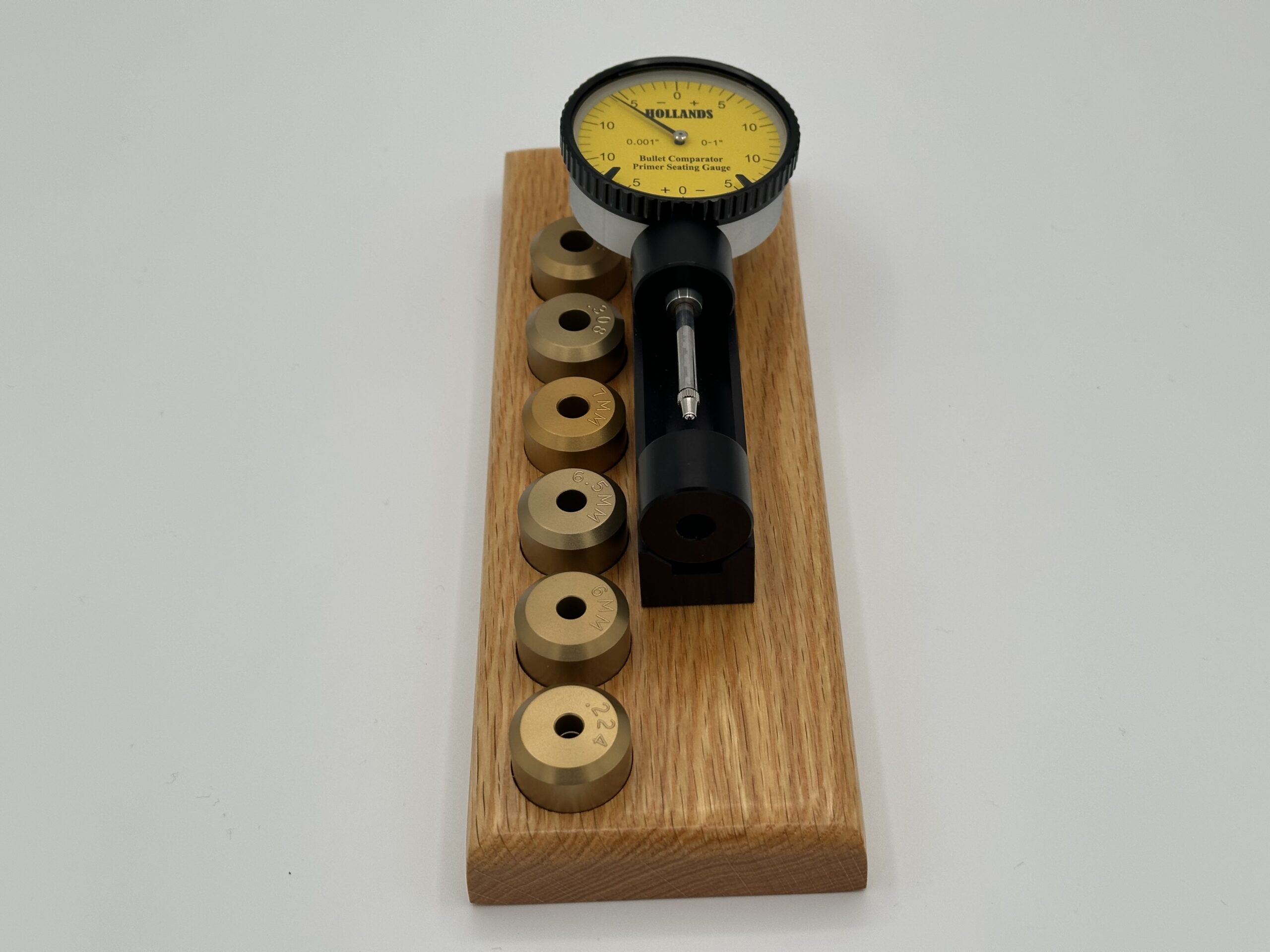 This is simply the fastest, most accurate bullet comparator on the market! Our Patent Pending design holds the bullet for repeatable accuracy to plus or minus .0003″ with proper technique. Sort bullets faster and more precisely than other units on the market. The Oak base plate holds the unit firmly to the loading bench, allowing two hands to quickly process bullets. Sorting bullets to a precise length (base to ogive) is a “must do” procedure for “F” Class shooters and long-range fanatics. This process makes for more precise BC’s and more consistent grouping at long range. Take your performance to the “Next Level” with a Holland’s Gold Standard Bullet Comparator! Each unit comes with bullet guides in .224, 6mm, 6.5mm, 7mm, .308,and .338 calibers.